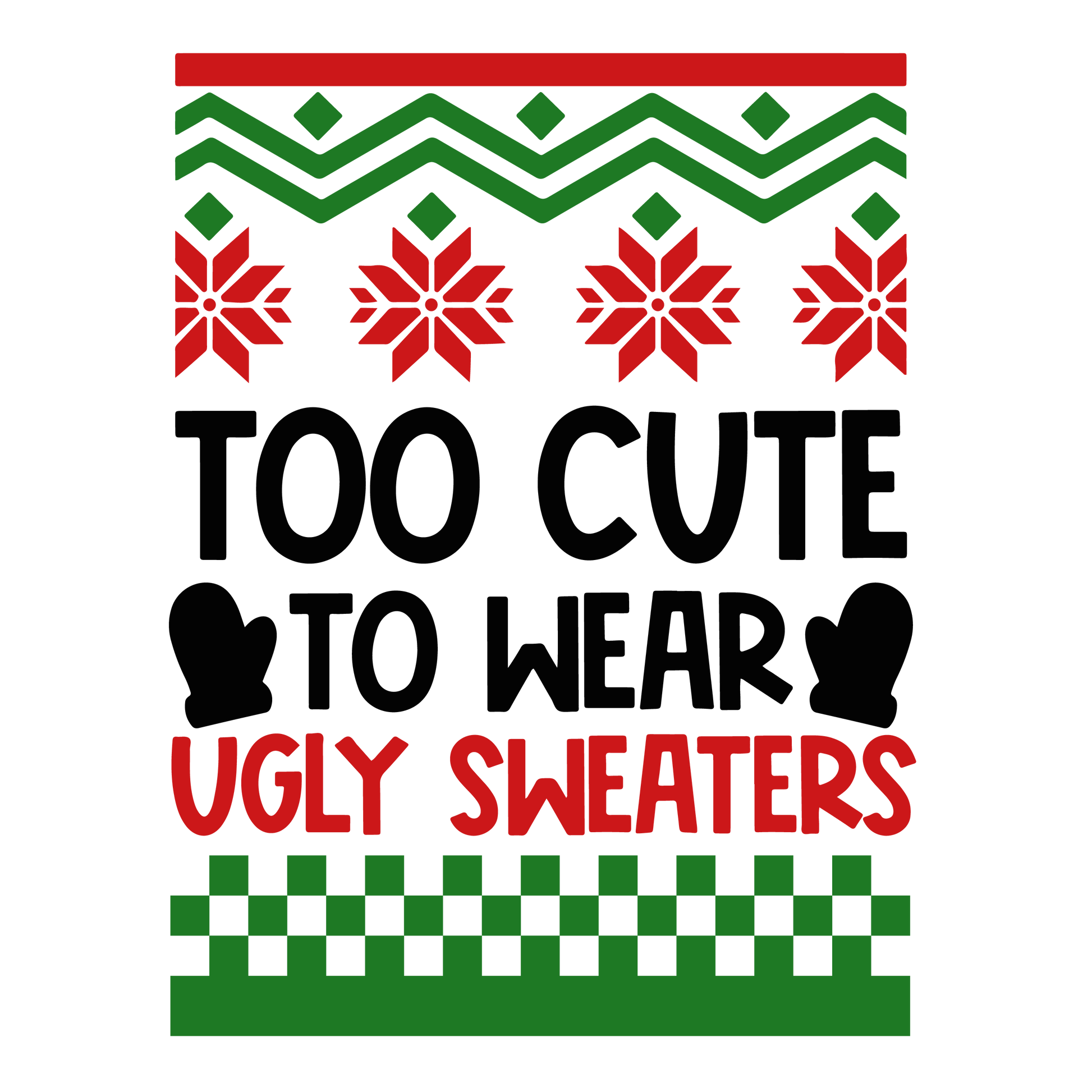 CREW SWEATSHIRT T-Shirt: "Too Cute to wear a Ugly Sweater " - FREE SHIPPING Christmas