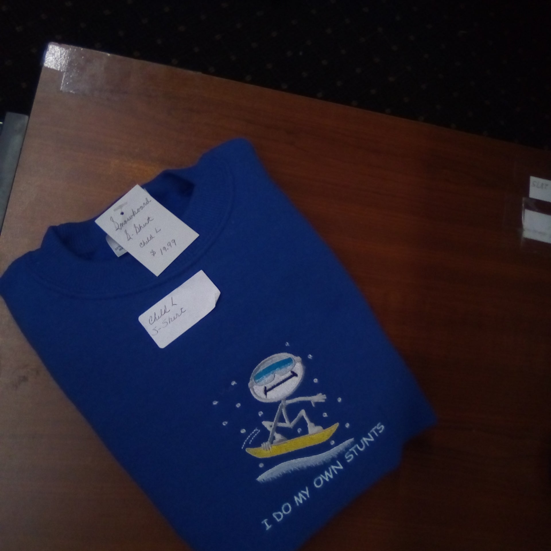 Keep your little one warm and stylish with this colorful child sweatshirt. Featuring a small embroidered icon with a stick figure snowboarding and fun text, this blue sweatshirt is the perfect way for your kid to show off their adventurous spirit and make a statement! Great for any winter fun trips or as a birthday gift! I do my own stunts!